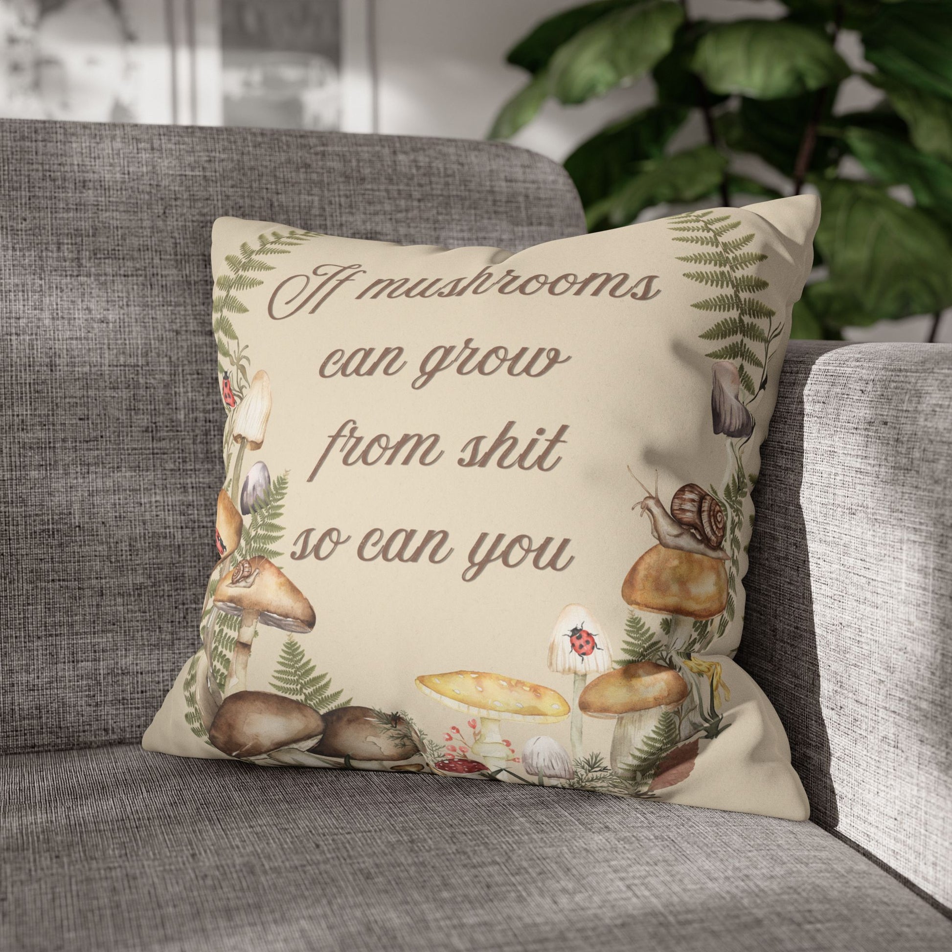 This vintage-inspired pillow cover pairs soft botanical illustration with unapologetic encouragement. Featuring hand-painted style mushrooms, ferns, and forest details, it delivers a gentle reminder that growth can come from even the messiest situations.